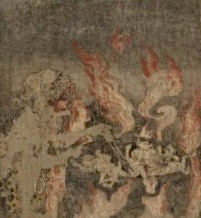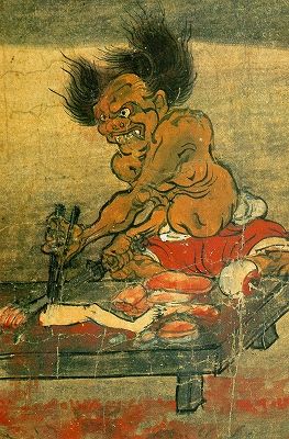 ここは、動物を殺して皮を剥いだりした僧侶が堕ちる地獄らしい。当時の僧侶に、そういうことをして皮を利用したり売ったりする輩がいたのであろうか。鬼たちが肉ごと背中の皮を剥ぎ、僧侶たちは血まみれで肋骨を露出させてうつ伏せに倒れている。なかなか凄惨な描写である。