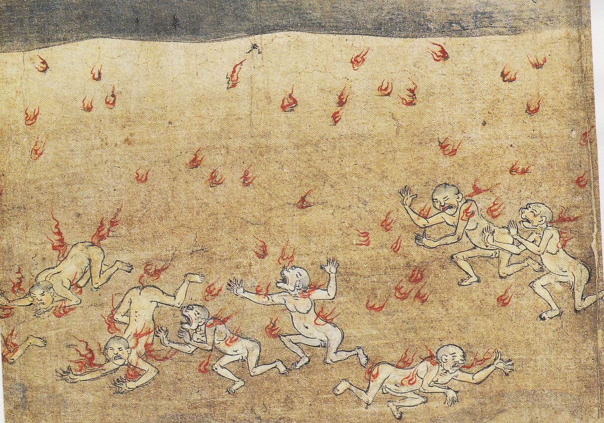 ここで提示されている地獄は、生前に仏の道を外れた僧侶が堕ちるところで「沙門地獄草紙」とも言われる。詞書も入手できないものがあり、さらに詞書があっても解読が済んでいないので、解説にはネット上で調べた分かる限りのことを書いておく。