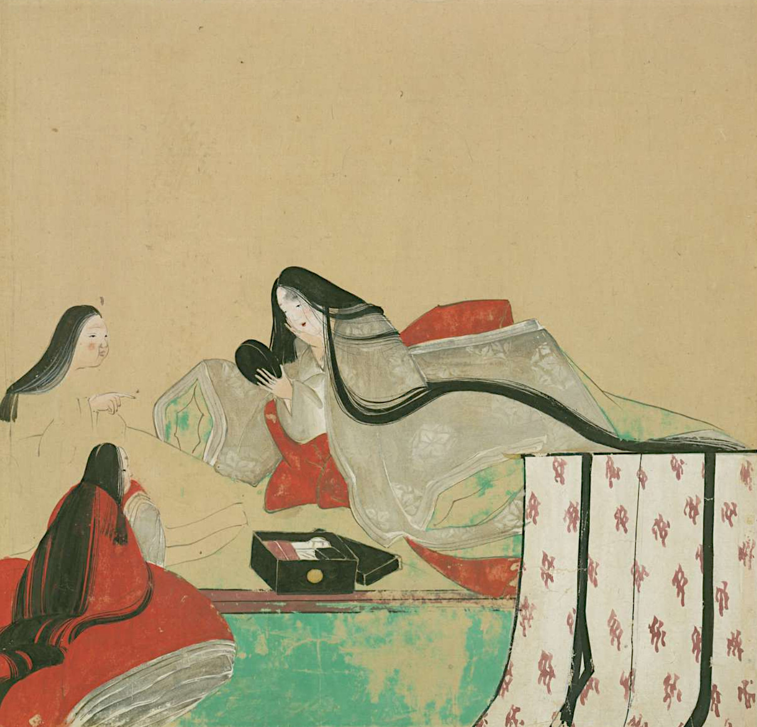 宮仕えと思われる女の顔にあざがあり、鏡をのぞき込んで悩んでいる。詞書にはこうある。