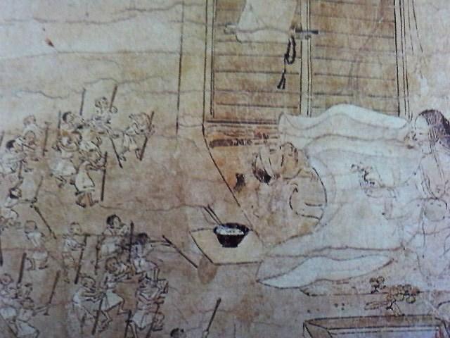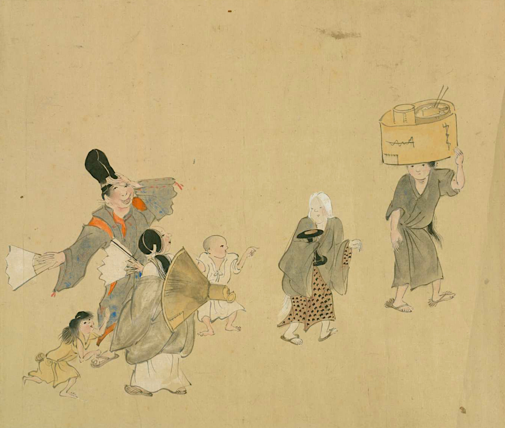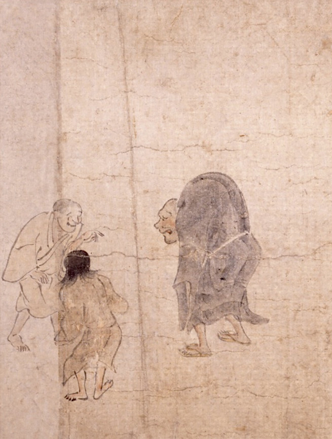 背中の骨が完全に折れ曲がってしまった男で、おそらくせむしの男であろう。二人の若い男の子が指さして笑いものにしている。詞書が完全に分からないのだが、背中に大きな瘤ができて、救える人もなく、都にやってきて、頭を反らせて乞食をするが、見る者はみな笑った、というようなことが書いてある。他の絵でもそうだが、この時代は人と形の違う奇形は明らかな差別対象で、皆でおおっぴらに馬鹿にしていたことがよく分かる。