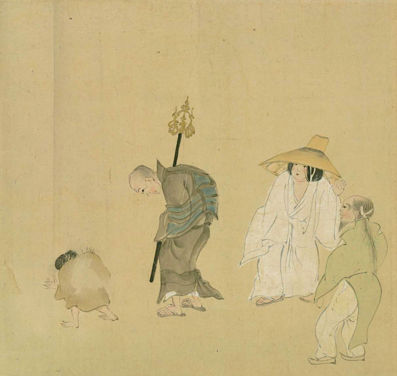 腰が完全に曲がってしまった乞食僧である。まわりの人が奇異の目で見て、子供がはやし立てている。詞書にはこうある。
