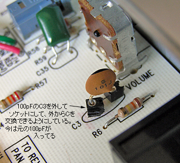 ちょっとやってみたのだけど、250pFにするとさらにキンキンしたので、逆に68pFにしたら少しおとなしくなり、まあまあな感じである。ここは、47pFあたりがいいんじゃないかと思えてきたので、今度、秋葉原に行ったときに47pFのシルバーマイカでも買ってくるか、ってことになった。