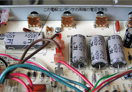 4つの灰色の大きな電解コンデンサが見えるが、これらに高圧がチャージされている状態だと感電するので危ない。ふつう、真空管がちゃんと熱くなっている状態(音が出るふつうの使用状態)で電源をオフにすれば20秒ほどでこれらは放電しているはずだが、電源を入れてすぐ切ったりすると残っていることがある。なので、まず最初に、テスターで一番大きな電解コンデンサの両端の電圧を測って、それが10V以下であることを確認してから作業した方がいい。もし、これが100V以上とかになっていると危険なので、10kΩていどの抵抗を介して放電してから作業する。