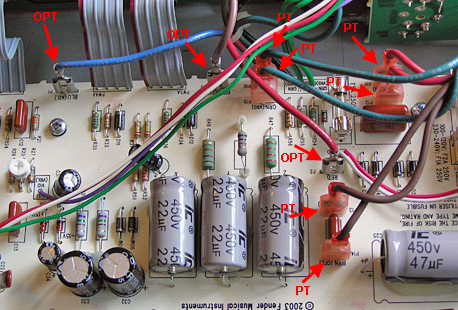 Billmさんの改造では、結合コンデンサは残らずぜんぶオレンジドロップに交換する。そうすることで、こもった音をなくし、ディストーションをクリーミーにし、甘いクリーントーンが得られる、などなど、いろいろ書いてあるところは、ネット上に山のようにあるコンデンサ銘柄によるトーン作りそのものである。