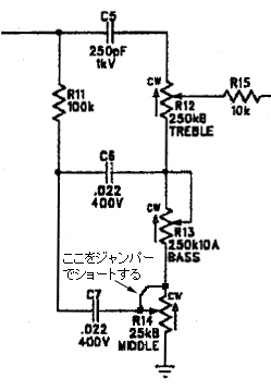 これは何をやっているかというと、こういうことである。ブルースジュニアでは、トレブル、ミドル、ベースを全部ゼロにすると、なにやらもやもやっとした音が出る状態になる。これはミドルのレベルが落ちきらずに少し出てきているのである。それで、これを改造してツインリバーブタイプにすると、以上3つをゼロにすると音はまったく出なくなる。そっちの方がいい、という解釈である。
