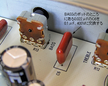 どういう風に変わるかについてはBillmさんのココにあれこれ詳しく書いているが、要は「ベースを強調することでBlues Junior独特のこもった音を解消する」ということだそうだ。まあ真偽のほどは置いておき、昔のFenderのアンプではたしかにここの値は0.1μFが主流なことは確かなようである。