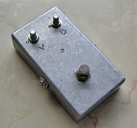 中の配線を平ラグ版を使ったものに変えて、さら線材に太い単線を使い、強度と音の抜けをよくしようなどという変更である。あと前回までのヤツは部品もありあわせのものだったけど、今回は抵抗とコンデンサにちょっとだけ良いもの使ってみた。加えて、ペダルを踏んだときのインジケータのLEDも付けておいた。外装はほとんど同じくで以下である。