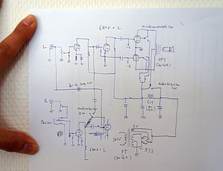 とか何とか考えはじめたら、どこで思いついたんだか、エレキギターも弾けるようにしたいなと思い始めた。オーディオもギターも同じアンプなんで、両用にするのはそれほど難しくないけど、なんだかんだでいろいろスイッチをつけたり真空管を増設したりしないといけないので、先ほどの売り物にもなるオーディオアンプ、という趣旨から外れてしまう。なにかうまい手を考えないといけない。