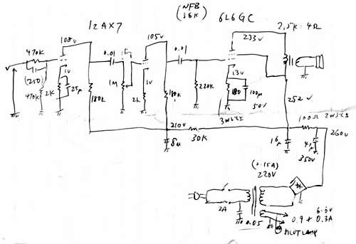 回路図はあるので、クローンを作っても良かったのだろうが、何となく自分だけのものが作ってみたい気の方が大きく、自前で設計してみた。とはいえ、ベースになる回路をFender Champシリーズのシングルエンドの小出力のものとし、電源電圧を下げ、整流管をダイオードにして、回路係数を設計し直したものである。今では、シングルエンドなら何とか設計できるようになっているのである。パワー管に6L6GC、プリアンプ部には12AX7を一本使い、二段増幅する、もっともシンプルな構成である。設計と言っても、ハイファイアンプじゃない、という意識があるので結構大雑把である。まず電源電圧を決め、後は、特性表を手に入れて負荷線を簡単に引いて、バイアス電圧を決めて、カソードの抵抗値を決定するていどである。オーディオの場合は、歪み率最小条件などいろいろあるようなのだが、すべて無視である。これは、後で聞いた話しだが、プッシュプルの片方の真空管を抜いて鳴らしたら、凄まじくいい音だった、などという報告まであるのがギターアンプの世界である。種明かしは、AB級シングルエンドになったせいで波形が上下非対称、その音が最高、という訳である。ハイファイオーディオとはかなり世界が異なっている。