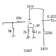 このグリッドに直列に入る抵抗だが、この後の段でもグリッドの入力部分に220kや470kとかけっこうでかい抵抗がシリーズに入っていて、これでかなり高域が落ちる。この抵抗は、意識的に高域を落としているという意味もあるだろうが、高域の発振止めや、放送電波の入り込みなどを防止する意味もある。