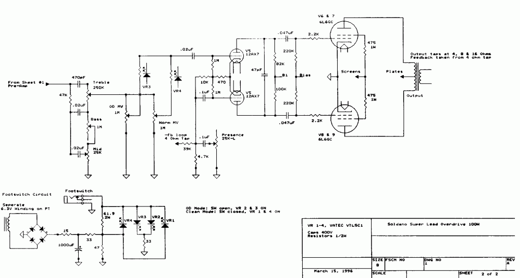 この回路を決めるにあたって今回参考にしたSoldanoのアンプは、「SLO-100」と「SUPER LEAD 60」の二つで、回路図は以下である。相変わらずでかくて見にくいが、後々のためにちゃんと載せておく。図をクリックして行けばオリジナル解像度で見られる。
