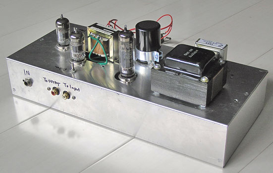 さ て、ミニパワーアンプ部であるが、ミニアンプというと定番では6V6や6BQ5のシングルで5Wていどというのがポピュラーだけど、それじゃ面白みがない のでちょっと変わったのにしたい。となると、12AU7や12BH7など比較的電流をたくさん流せる双三極管をプッシュプルにして2Wから5Wぐらいまで 出してやるというのが思いつく。12BH7のプッシュプルは最近、かのUSAのギターメーカーのKendrickが出しているそうで、ちょっといい感じ だ。
