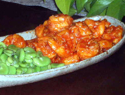 ◆エビを戻し入れ、ネギを乗せ、少量の水溶き片栗粉を加え、かき混ぜながらとろみをつける。火を強火にし、鍋を揺すりながら底を焼き、酢小1、ゴマ油少量を加えて皿に盛る。塩ゆでしたそら豆を添える