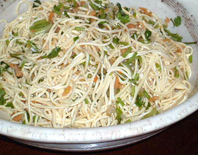 ◆豆腐干、香菜、干しエビをボールに入れ、姜葱ソース適量、ゴマ油、化学調味料各少々であえる
