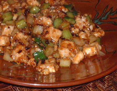 ◆魚肉を油通しする。キュウリとセロリを軽く炒め、熱湯を杓子一杯さし、塩を入れ、1分ぐらい煮て水を切る