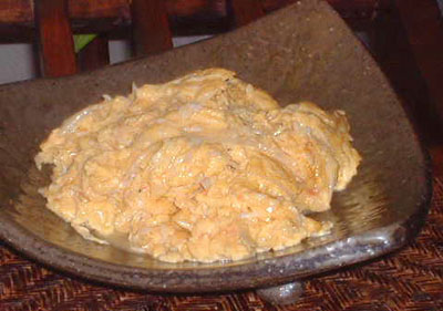 ◆鍋をきれいにし、油大3の多めの油を強火で熱する。煙が出始めたら卵汁を一気に入れる。回りが泡立ってくるので、これを杓子で内側に折り込むようにして、全体を何重にも折り込むように混ぜ、真ん中にひとつにまとめる