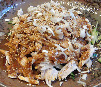 棒棒鶏 おなじみバンバンジー。胸肉を水から煮て沸騰したらすぐ火を止めてふたをして1時間以上余熱で火を通すと柔らかく仕上がるんです。とかなんとか言って、キッチンで慌てて(あるいはのんきにビール飲んでて)ふと気づいたらぶくぶく沸騰してたんであわてて火を止めました。このせいでちょっとパサっとしたかも。今回、これは最後に出すスープを煮出すのを兼ねてます。胸肉2枚のダシでなかなか繊細なスープになるんです。ラー油は四川省産の特別トウガラシでその場で作りましたが、香りイマイチ。1年前シンガポールで買ったトウガラシがちょっと古かったですね。 → レシピはこちら |