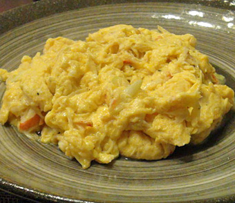 カニ玉 いつもはカニカマボコで経済的に作っちゃうんですが、今回のは本物のカニ肉。このころになるとちょっと(かなり?)酔っ払っていて、調子に乗って塩を入れすぎちゃいましたね。高級カニ肉なので特に塩は控えめの方がいいですね。きちんと炒めることができれば、とても香りのいい卵焼きになるので、味はあっさりと薄めでぜんぜんOKなんです。下記リンクのレシピはカニカマです。カニカマの方がカニの味が強烈なので一見おいしく感じたりするんですが、やっぱり本物のカニ肉の格調高さにはかなわないですよね。 → レシピはこちら |