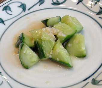 キュウリのニンニクあえ 簡単にできてわりとおいしいキュウリのあえもの。最初にゴマ油でニンニクを炒めるときに焦がさず、白いまま、辛みをうまく飛ばせれば、それで成功。ソースを作るときに火を通すので少し暖かい状態で出来上がるんだけど、少し冷ましてから上卓した方がよいですね。あわててたので暖かいまま出しちゃいました。ただ、これ、長く漬けると味が悪くなります。 → レシピはこちら |