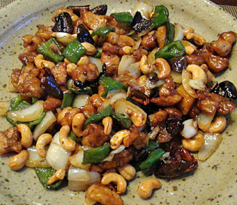 鶏肉とカシューナッツのトウガラシ炒め 赤黒く見えるのがトウガラシで、これは四川省産の朝天辣椒というやつです。大ぶりでふっくらした形で、辛みより香りが強い乾燥トウガラシです。このトウガラシと粒山椒を炒めた油を使った四川料理です。味付けは軽い甘酢をきかせたショウユ味。今回、オイスターソースを少しだけ入れています。もうちょっと酸味をきかせてタレを多めに仕上げてもよかったですね。 → レシピはこちら |