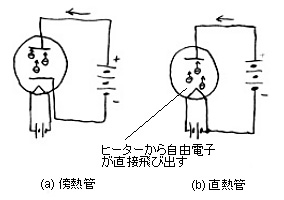 ここまでで説明した2極管では、ヒーターとカソードは別々になっていた。これに対して、カソードのような板を特別に設けずに、右図(b)のようにヒーターから直接電子を放出させて動作するタイプもある。こういった構造の球を「直熱管」と呼ぶ。これに対して(a)のようにカソードのあるタイプを「傍熱管」と呼ぶ。カソードが独立していると、ヒーターの電源が動作に影響しないので傍熱管の方が使いやすく、真空管の大半は傍熱管である。