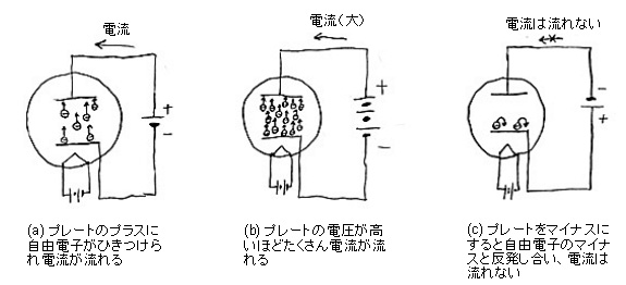 ここで、下図(a)のように、ヒーターに電流を流してカソードを熱し、プレートにプラスの電圧をかけると、先の2極管と同様に、カソードから電子が飛び出し、プレートへ流れ込み、結局、プレートからカソードに向かって電流が流れる。ここで、間にグリッドがあるのだが、グリッドはほとんどスカスカなので、電子の流れをほとんど邪魔しない。
