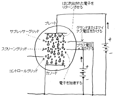 ここまではいいのだが、加速されて高速になった電子がプレートにぶつかると、今度はプレートの板の中の自由電子が、飛んできた電子に弾き飛ばされ(2次電子という)、それが今度はスクリーングリッドのプラスに引き寄せられ、スクリーングリッドの電流が増加してしまう。結局、プレートの電流を増やしたいのにスクリーングリッドの電流が増加してしまうという羽目になるのである。