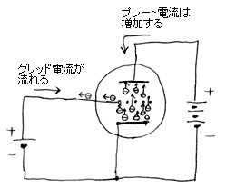 このように、グリッドにかけるマイナス電圧で、プレートに流れる電流をコントロールすることができるわけだ。そういうことから、このグリッドをコントロールグリッドと言う。グリッドはカソードに接近した位置にあるので、グリッドのマイナス電圧は小さくても、プレート電流をよく制御できる。それから、グリッドはマイナスになっているので、カソードから出た電子はグリッドの方へは流れ込まない。すなわち、グリッドには電流がまったく流れないわけだ。つまり、電圧さえかければいいわけである。その小さな電圧だけで、大きなプレート電流を自在に制御できるので、これが増幅作用を持つことになる。小さな電圧で大きな電流を制御できると言っても、電圧と電流は違うんだから比較できないじゃないかと思うかもしれない。これについては、次節以降を読み進むと分かってくると思う。