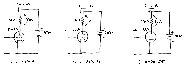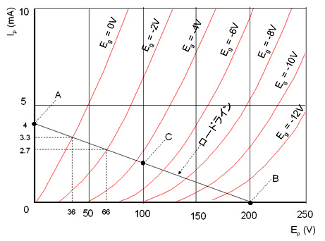 = 2mAなら同様に計算して、Ep = 2(mA) × 50(kΩ) = 100Vなので、C点になる。結局、この回路では、EpとIpは図中の線分の上に必ず乗っていることが分かる。この線をロードラインと呼んでおり、これさえ引ければだいたい何とかなる重要な基本である。このように、ロードラインは電源電圧と負荷抵抗が決まれば一意に、一本引くことができる。