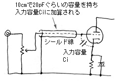 また、内部配線で使うシールド線だが、これもけっこう大きな容量を持っている。ふつうのシールド線で10cmで20pFていどあるので、30cmも引き回せば60pFになって、これを右の図のように真空管のグリッドへの配線に使ってしまうと、真空管の入力容量にプラスされるので事態はさらに悪化する。