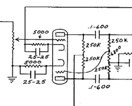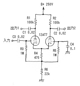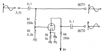 これは、真空管の増幅回路一段で位相が反転することを利用したもので、上側の信号はそのままで、下側の信号はR1とR2で分圧してあらかじめ小さくしておき、これを下側の真空管で増幅して上側の信号と同じレベルにする。もちろん、これで下側の位相は反転している。このR1とR2の分圧比を下側真空管のゲインと同じにしておけば、レベルは同じになる、ということになる。上記の回路では真空管は6SL7GTを使っていてゲインがだいたい40前後、R1とR2による減衰は0.026
