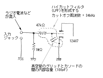 ここでは、ギターのシールドを突っ込むアンプの入力回路について簡単な説明をしておこう。製作編のアンプの回路では図のようにきわめてそっけない入力回路を使っている。入力は一つだけで、入力ジャックの後ろに、グリッドに並列に1MΩの抵抗が入っているだけである。