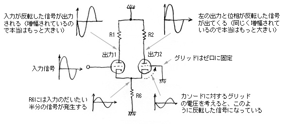 それでは、今度は右側の真空管に目を移してみよう。グリッドは接地されていてゼロである。しかしカソードは先に説明したように信号電圧でゆれている。と、いうことは、右側真空管のカソードを基準としたグリッドの電圧というものを考えると、図のようにちょうど位相が反転した信号が加わっている、ということになる。そして、右側真空管も普通の電圧増幅回路の形をしているので、この反転した(カソードに対する)グリッド電圧が増幅され、出力2に増幅された信号が出てくる。と、いうわけで、出力2には出力1と位相がちょうど反転した信号が出てくるのである。