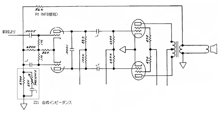 PRESENCEについてはNFBのところでも少し触れた。トーンの振る舞いとしては、PRESENCEを上げるほど高音がきつくなって輪郭のはっきりした音になる。このPRESENCEは、一般には次の図のような回路になっていて、これは出力段のNFB(負帰還)の量を調整して高域を持ち上げているのである。