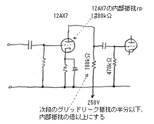 このように、ざっと考えてもいくつもの要因が関係しており、こうしないといけない、という決まりは無く、各々の妥協点の適当なところに落ち着くわけだ。下の図の回路では、次段のグリッドリーク抵抗R4が470kΩで、12AX7の内部抵抗は規格表から80kΩ(プレート電圧が100Vのとき)と書いてあるので、負荷抵抗R3を470kΩと80kΩの間の、たとえば180kΩと決めてもよいだろう。