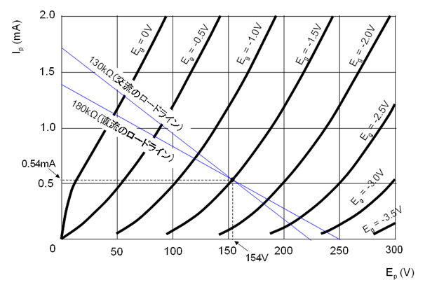 | 12AX7の負荷抵抗180kΩのロードライン |