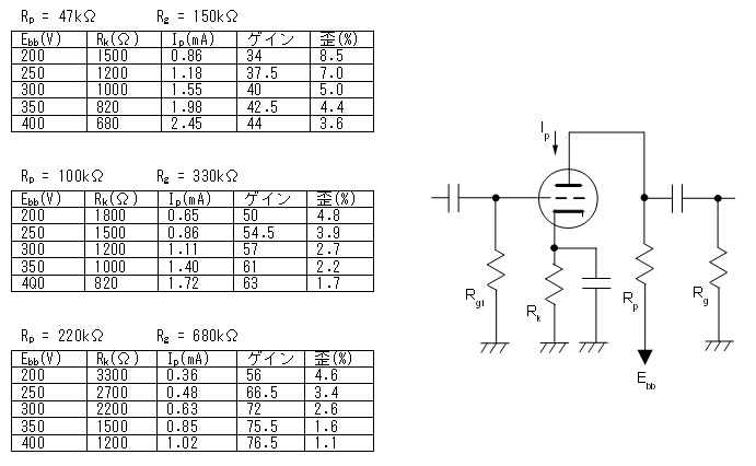 これらの値をそのまま使えば間違いはない。例えば、電源電圧Ebbを250Vにして、負荷抵抗Rpを100kΩに決めれば、カソード抵抗Rkは1.5kΩになり、プレート電流Ipは0.86mAになる。これは上の2つ目の表の上から2番目の値である。ここで、Rg