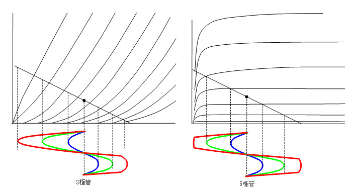 この図は、入力信号を大きくして行ったときに、3極管と5極管でどのように出力信号が歪んで行くかを示した図である。黒丸がバイアス点で、ここではロードラインのほぼ中央の一番ベストな点を選んでいる。入力信号が、青→緑→赤、の順で大きくなって行ったときの様子である。様子をまとめると