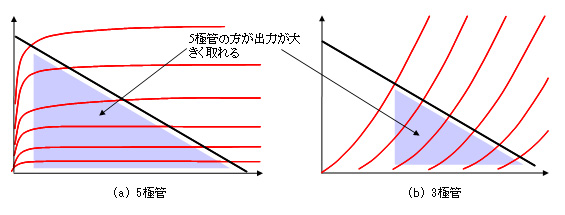 | 5極管と3極管の特性の違いと出力電力の様子 |