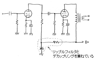 アンプの回路図を見ると、右の図のように電圧増幅段へ一種のCRフィルタを通して供給しているのが分かる。これは、電源回路の平滑回路と同じ形なのでリップル除去用のフィルタとして働くが、もう一つ大切な役目がある。それは、増幅回路の各段を分離するということで、これをデカップリングと呼ぶ。