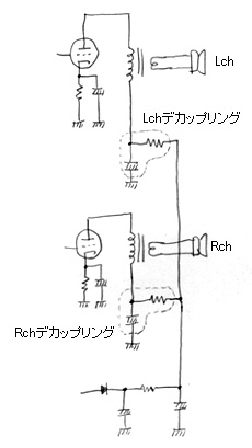 これを避けるには、Cを巨大にしてインピーダンスを十分下げるのも一つの方法だが、下の右の図のようにLchとRchの間にもデカップリング回路を設けるのがふつうである。こうすることで、低域のクロストークはずいぶんと改善される。