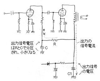 ここで下の左の図のように、Rを入れずに、Cだけで2段分の電源を供給してみよう。そうすると、2段目のプレートに流れる信号電流はCを通ってグランドへ抜けるが、そのときCの両端に信号電圧を発生させる。よくみるとこのCの両端の信号電圧はそのまま1段目の出力に加わっていることが分かる。つまり、出力が入力に戻ってしまう現象が発生するのである。出力が入力に戻ってしまうと発振の恐れもあるし、動作が不安定になる。このCが巨大でインピーダンスがほとんどゼロとみなせれば大丈夫な道理なのだが、インピーダンスは低域ほど高くなり、無視できなくなる。結局、低域で発振などの困った現象が起こることになる。