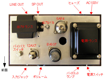 さて、そういうわけで、部品配置について守った方がいい原則を説明しておこう。それは、電源トランスなどの電源回路の部分と、真空管や出力トランス、ボリュームなどの信号部分をなるべく位置的に分離して離すことである。作例では、電源部分が向かって右、信号部分が左に集められている。