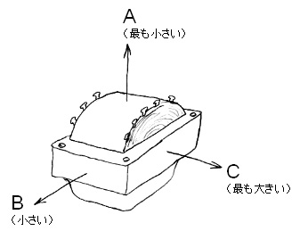 電源トランスの向きも重要である。今回使った図の(a)ようなトランスは伏型と呼ばれるタイプだが、この場合、AまたはBの方向が信号部分を向くようにする。一番悪いのはCの方向が信号部分を向いた場合である。実は、トランスに流れる交流電流が、トランスの回りに交流磁束というものをまき散らすのだが、その大きさがC→B→Aの順に大きいのである。この交流磁束が信号部分に入り込み、交流(関東なら50Hz、関西なら60Hz)の誘導ハムという「ブーン」というノイズを発生することがあるのだ。また、立型と呼ばれる(b)のようなトランスでは、A、B、Cは図のようになるので、AまたはBが信号方向を向くように配置する。