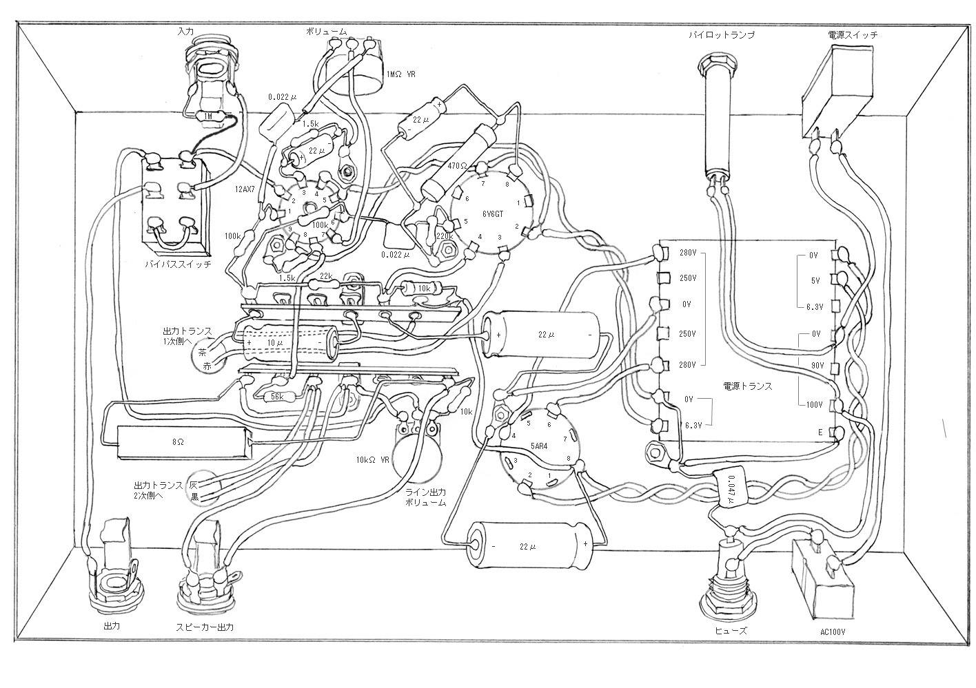 | 6V6GTギターアンプヘッドの実体配線図(クリックで大きくなります) |